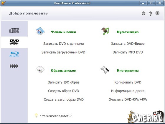 - Запись с любых типов носителей CD/DVD, а также Blu-Ray (BD-R/BD-RE)