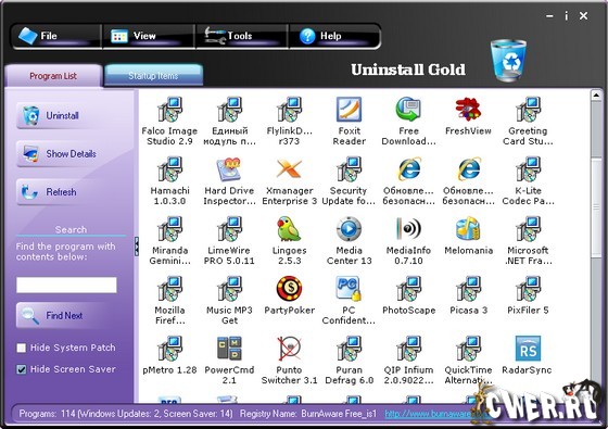 Uninstall Gold - программа для деинсталляции приложений. Обладает большим количеством функций: показывает скрытые установленные программы, сортирует список программного обеспечения по заданному фильтру, удаляет некорректно инсталлированные и деинсталлированные программы.