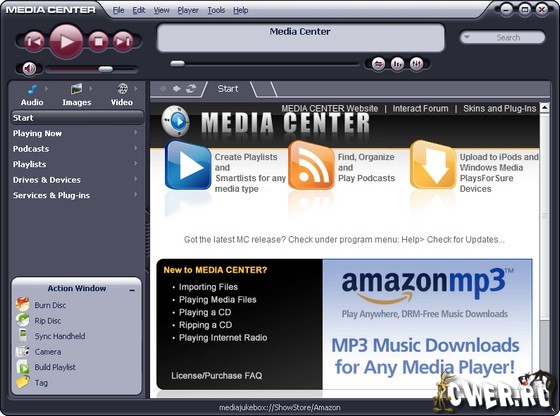 J.River Media Center - мультимедийный центр (раньше назывался Media Jukebox). Проигрывает большинство популярных аудио и видео форматов, включая MP3, аудио CD (поддерживает CDDB) и DVD, может преобразовывать CD-аудиотреки в WAV и MP3, переписывать на жесткий диск виниловые диски и кассеты (убирая при этом помехи и шумы), а также создавать аудио-CD, причем для всех этих функций программа имеет множество настраиваемых параметров. Кроме этого, есть очень хороший и мощный по своим возможностям органайзер мультимедийных файлов, медиаредактор, эквалайзер, встроенный DSP и удобный планировщик заданий для автоматизации процессов проигрывания/записи, а также поддержка пульта ДУ. Из необязательных, но приятных функций - становящаяся уже почти стандартом для "приличных" программ возможность изменения внешнего вида с помощью скинов, мини-режим проигрывателя и "телевизор" (c картами ATI).