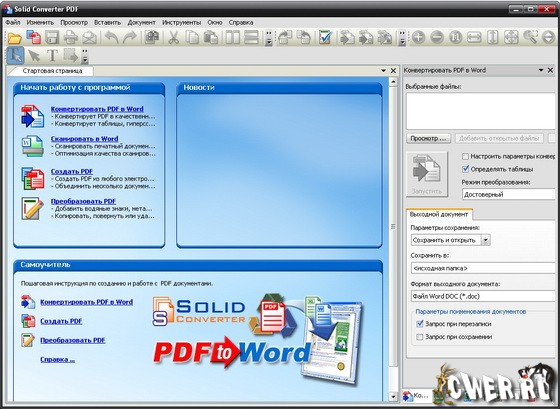 Solid Converter PDF - одна из замечательных программ для создания и преобразования PDF документов от компании Solid Documents. Конвертирует PDF файлы в редактируемые документы Microsoft® Word. Программа позволяет производить конвертирование таблиц из PDF документа в таблицы Micrsoft® Excel. Преобразование всего документа или заданного диапазона страниц. Конвертирование выделенных таблиц и рисунков из PDF. Создание таблиц в Word или Excel или файлов с изображениями. Конвертируемые документы не требуют переформатирования и доработки. Удобный способ создания PDF файлов из документов любого формата. В программе имеется пользовательский WYSIWYG интерфейс. Также программа имеет пакетный режим конвертирования, что позволяет вам производить множественное конвертирование с использованием панелей программы или режима командной строки. Интерфейс программы переведен на множество языков, включая русский язык.