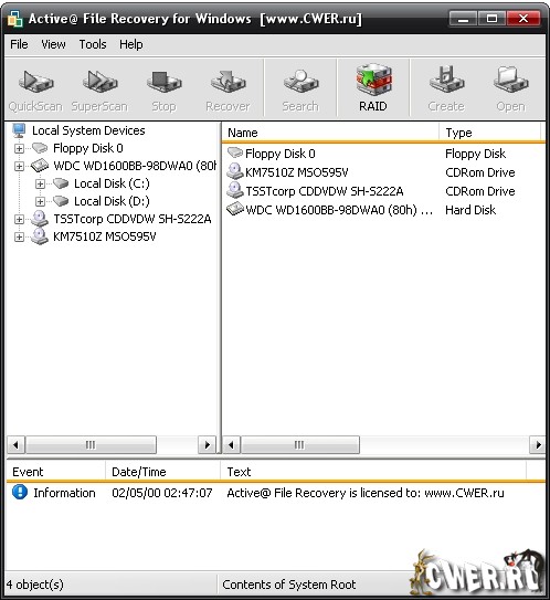 Active File Recovery - программа обеспечивает восстановление данных в результате случайного удаления, повреждения, вирусной атаки или форматирования. Поддерживает работу с файловыми системами FAT12, FAT16, FAT32, NTFS, NTFS5, NTFS+EFS. Умеет работать напрямую с жестким диском (для случаев, когда нарушена его логическая структура), может создавать образы дисков для переноса данных на другие HDD или резервного копирования. Поддержка RAID массивов и томов (RAID-0, RAID-1, RAID-5, Span). Два типа сканирования дисков: простое (быстро) и суперсканирование (медленно). Поддерживает все типы HDD (IDE, ATA, SCSI), USB устройства, а также карты памяти SunDisk, MemoryStick, CompactFlash и т.д. Есть возможность использования Active File Recovery без установки на жесткий диск - с диска.