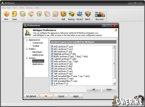 BitZipper - программа для работы с архивами 20-ти различных форматов (ZIP, RAR, CAB, TAR и т.д.). Помимо стандартных для архиваторов функций, она может создавать самораспаковывающиеся архивы семи типов, сканировать архивы для обнаружения вирусов, конвертировать архивы из одного формата в другой.