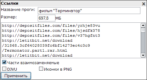 6.4. В появившейся панели вводим название того, о чем новость в винительном падеже, размер файла в МБ или ГБ (только цифры и запятая), а также вставляем ссылки на скачивание файла. Далее нажимаем кнопку "Применить", и код ссылок вставляется в поле текста новости.