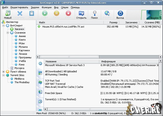 BitSpirit - мощный и удобный в использовании клиент BitTorrent, который не только работает по этому протоколу, но также имеет ряд дополнительных возможностей.Среди них следует отметить: удобный и понятный интерфейс, возможность работы сразу с несколькими закачками, механизм кеширования данных на диск, быстрое восстановление работы, поддержка выбора файлов, удобный файловый менеджер, поддержка опции обмены сообщениями, компрессия по алгоритму GZip, работа по расписанию, интеграция в IE, поддержка HTTP/SOCKS4/5 Proxy, малая требовательность к ресурсам ПК.