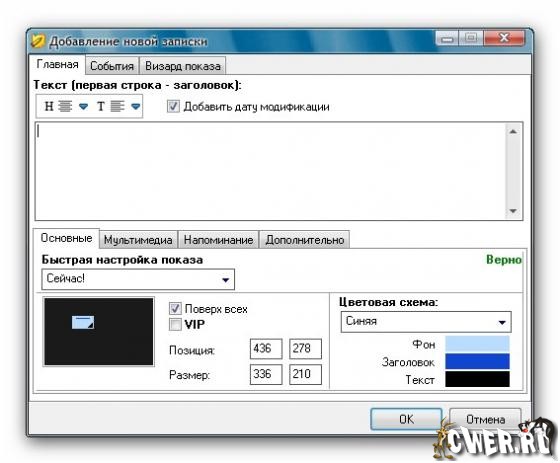 -настраивать параметры заметок по умолчанию (размер, цвет текста, фона и -заголовка заметки, положение на рабочем столе, прозрачность заметки; "горячие" клавиши)