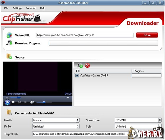Ashampoo ClipFisher - программа для просмотра и сохранения потокового видео из интернета на компьютере. Для работы с утилитой достаточно указать веб-адрес потокового вещания и программа сохранит выбранный фильм в форматах FLV или WMV. Кроме того, программа позволяет указать качество, с которым будет сохраняться видео, а также ограничить размер конечного файла, при достижении которого, запись будет прекращена. При необходимости средствами утилиты можно просмотреть загружаемый видео файл.