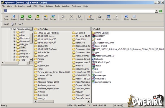 Поддерживается работа с сетевыми дисками, причём, в подключённых сетевых дисках при необходимости происходит автоматическое обновление файлов. Программа может работать как с отдельно взятыми файлами, так и с файлами в пакетном режиме. Для удобства и быстрого открытия какого-либо файла или каталога, можно поставить закладку. Встроенные средства этого менеджера позволяют просматривать графику, предварительно прослушивать аудио и просматривать видео файлы, а также файлы форматов HTML, Text, RTF и Hex. xplorer2 можно рекомендовать для работы и компьютерным новичкам, и пользователям, имеющим большой опыт.