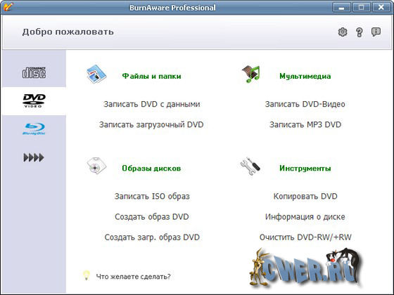- Запись с любых типов носителей CD/DVD, а также Blu-Ray (BD-R/BD-RE)