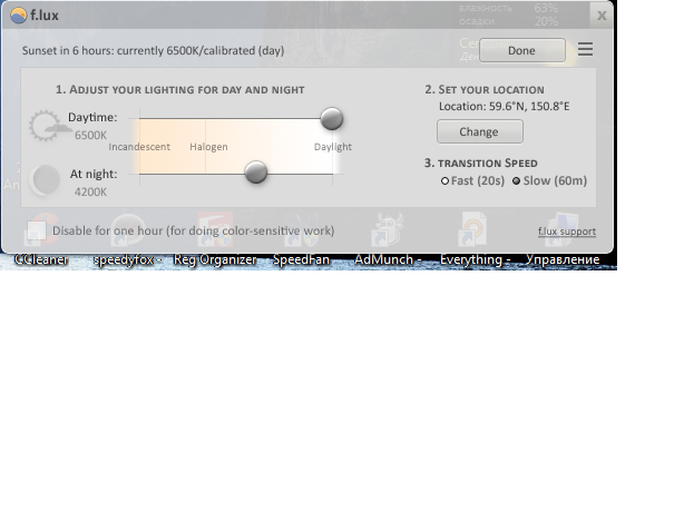 Программа, изменяющая цветовой профиль вашего монитора в зависимости от времени суток, которую можно бесплатно скачать на cwer.ws. Собственно, этим все сказано. Ночью глаза меньше устают от теплых цветовых тонов, днем — от ярких и холодных. На этом и основана программа. Существует возможность указания своих координат для правильной смены цветового профиля.