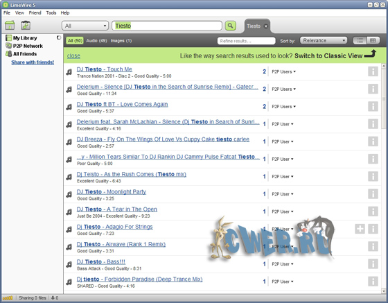 LimeWire - программа, предназначенная для обмена файлами между пользователями. LimeWire отличается от программ аналогичного назначения тем, что совместима практически со всеми P2P сетями. Если вы не знакомы с этой программой, то, чтобы её освоить, вам придется приложить некоторые усилия. Зато после её освоения вы сможете начать поиск и скачивание интересующего файла в бескрайних просторах интернета. После первого запуска LimeWire подключается к своему центральному серверу, анализирует состояние сети и делает запрос на интересующий вас файл. Можно искать всё, что угодно: MP3, игры, программы, картинки, текстовые документы разнообразных форматов и т.д. Для работы требуется наличие Java. Поддерживаются скины.
