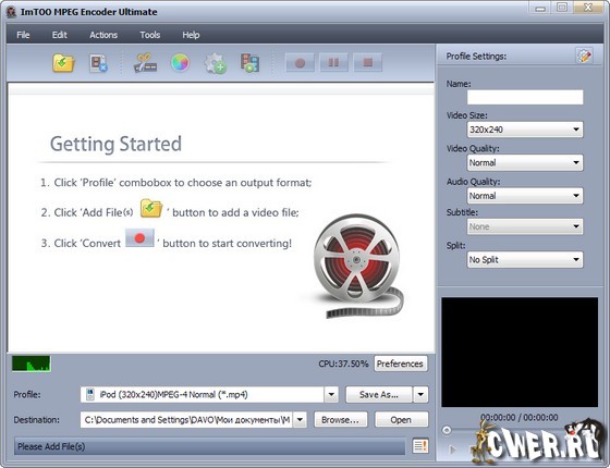ImTOO MPEG Encoder - мощная утилита для конвертирования видео-файлов. Программа позволяет конвертировать файлы любых форматов, таких как AVI, MPEG, DivX, WMV, MP4, MOV, FLV, 3GP, PSP MPEG-4, iPod MPEG-4 и другие. Помимо этого программа может извлекать аудиодорожку из видео-файлов, конвертировать большинство популярных звуковых форматов, таких как MP3, WMA, WAV, AAC, M4A и другие.