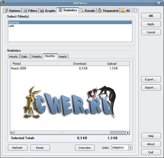 BWMeter - лучшая из утилит для подсчета трафика. Настраиваемые фильтры для разделения трафика по портам и ip-адресам. И в то же время очень простой интерфейс. Программа по умолчанию разделяет трафик на локальный и интернетовский, что и требуется в 90% случаев. Умеет выводить графики по каждому из фильтров. Показывает отчеты за день, неделю, месяц и год. Благодаря гибкости настроек может быть использована для подсчета трафика каждого из нескольких компьютеров, находящихся в одной сети, будучи установленной только на одном из них (зависит от конфигурации сети)