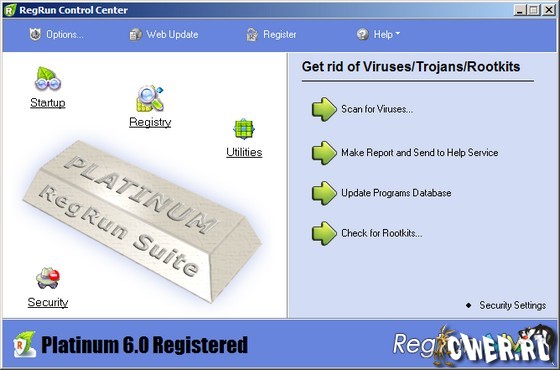 RegRun Security Suite Platinum - включает в себя около 25 полезных утилит для защиты компьютера от руткитов, троянов, шпионских и рекламных программ, ускорения загрузки Windows и помощи в решении повседневных задач при работе с диском и реестром. RegRun рекомендуется использовать для оптимизации системы и в дополнение к антивирусам для усиления защиты.