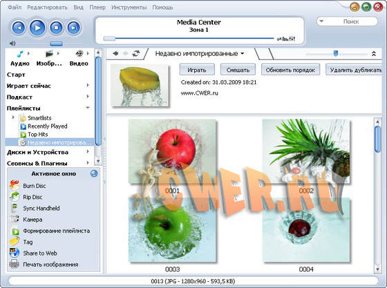 Программа дает возможность организовать коллекцию фотографий, просматривать детальную информацию о каждом файле. Уникальный полноэкранный режим позволяет работать с медиа-коллекцией, управляя ей с экрана монитора или телевизора. Поддерживаются различные пульты дистанционного управления. Media Center поддерживает множество моделей портативных плееров, позволяет синхронизировать медиа-библиотеку с iPod и многими другими устройствами.