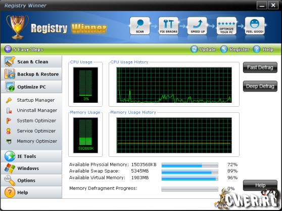 Registry Winner – программа для улучшения работы компьютера, которая находит ошибки, оптимизирует систему и ускоряет ее. Вы можете столкнуться с различными проблемами, которые постепенно появляются с использованием компьютера, например, замедление, зависание, «голубой экран смерти», постоянные сообщения об ошибках и т.д. Registry Winner использует только самые продвинутые технологии для сканирования ваших жестких дисков и дает вам наиболее полную диагностику всего за несколько секунд. Как только проблемы обнаружены приложением, Registry Winner предложит вам профессиональное и высокоэффективное решение для вашего компьютера.