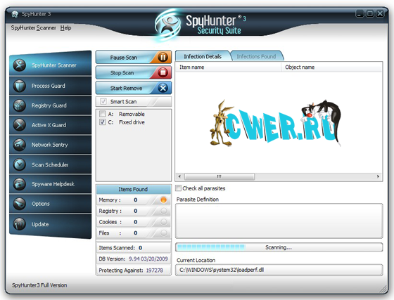 SpyHunter - программа, которая очищает систему от программ-шпионов, кейлоггеров, резидентных вирусов, при необходимости удаляет cookies, записи в реестре, оставленные шпионскими программами. Проверяет запущенные процессы, ключи реестра, элементы ActiveX.