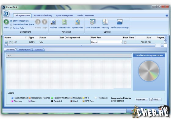 Данные в этой таблице отображаются в виде разноцветных квадратиков, расшифровку цвета которых можно посмотреть в главном окне PerfectDisk. Стоит отметить довольно быструю работу утилиты. Это связано с тем, что используется однопроходный метод дефрагментации с учётом S.M.A.R.T. данных винчестера. Может дефрагментировать не только локальные диски, но и с сетевые, причем в этом случае для облегчения настройки заданий используются профили сетевого планирования дефрагментации и полностью настраиваемое протоколирование работы. Поддерживаются работа с RAID-томами.