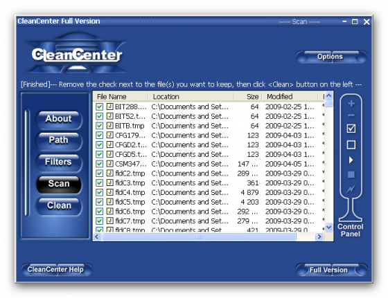 CleanCenter - служит для очистки жестких дисков от ненужных (временных) файлов, создаваемых во время работы приложений. Распознает порядка пятидесяти типов временных файлов и позволяет удалять их в автоматическом режиме.