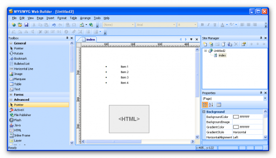 WYSIWYG Web Builder - программа для создания веб-страниц, которая автоматически создает HTML-код, в то время, как вы просто размещаете объекты, т.е. знание HTML от вас совершенно не требуется. Просто перетащите необходимые объекты в любое место страницы. После этого останется только закачать получившиеся файлы на сервер, с помощью встроенного инструмента "Публикация". Имеет, практически, все возможности MS Frontpage, но содержит значительно больше инструментов для работы с объектами (изображения, текст, таблицы и т.д.). Благодаря WYSIWYG Web Builder веб-страница в Интернете будет иметь точно такой же вид, как на экране ПК, независимо от используемого браузера.
