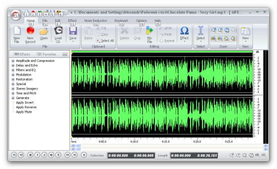 - Применение различных эффектов (усиление, задержка, выравнивание, скрытие, вставка, нормализация, возвращение, задержка различных дорожек, добавление тишины, вибрато, эхо, хорус).