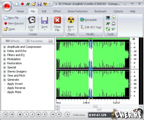 Cool Record Edit - звуковой редактор, который поможет вам перевести ваши пленки, пластинки, живые концерты, интернет-радио и любые источники звука в цифровой формат. Имеются множество фильтров и большое колличество различных звуковых эффектов. Всего лишь выберите источник звука, требуемое качество записи, громкость и начинайте запись. Редактор позволяет выполнять различные операции со звуковыми данными, имеются множество фильтров и большое колличество различных звуковых эффектов. Для удобства использования так же имеется встроенный CD-риппер.