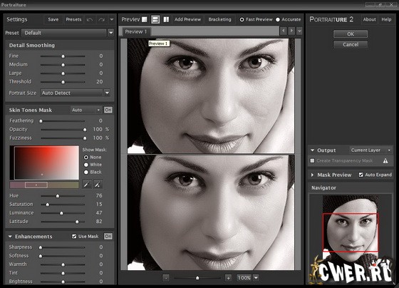 Imagenomic Portraiture - плагин для Adobe Photoshop, позволяющий ретушировать цифровые фотографии. Плагин позволяет устранять недостатки кожи, сохраняя текстуру и другие важные детали портрета, таких, как волосы, брови, ресницы и т.д. В настройках плагина вы сможете указать силу воздействия, смягчение, степень детализации и отрегулировать резкость, изменить тон, яркость и контрастность. Уникальной особенностью программы является встроенная функция автоматической маски, которая помогает быстро и автоматически обнаружить диапазон тона кожи на изображении, и, если желательно, вы сможете вручную настроить его, чтобы обеспечить оптимальные результаты - невиданную точность и производительность. Portraiture идет с предварительными установками для установки эффектов одним нажатием кнопки, и вы можете создать свою собственную последовательность действий, настроенную под ваши требования.