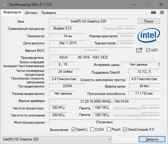 Что-то слабовато. Либо не полностью совместима с ноутбуками и с интегрированными видеокартами. Не все данные показывает: