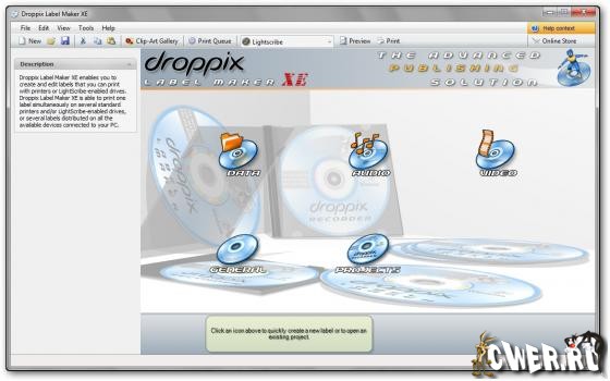 Программа для создания и печати высококачественных наклеек для дисков CD и DVD. Для создания наклеек Droppix Label Maker имеет профессиональные инструменты редактирования и большое количество шаблонов, изображений и шрифтов, которые можно использовать в дизайне этикеток. Программа работает как с технологией LightScribe (нанесение монохромных рисунков на поверхность диска), так и с любыми принтерами, которые печатают на CD/DVD.
