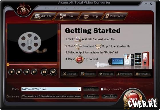 Aiseesoft Total Video Converter - программа предназначена для конвертации видео в форматы MP4, H.264, AVI, WMV, WMA, FLV, MKV, MPEG-1, MPEG-2, 3GP, 3GPP, MOV, RM, RMVB, M4A, AAC, WAV и т.д. Поддержка популярных мультимедиа проигрывателей, таких как: PSP, iPod, iPhone, PS3, Zune, iRiver, Walkman, Pocket PC и т.д. Функция извлечения аудиодорожек из входного файла и конвертации в форматы M4A, MP3, AC3, AAC, WMA, WAV, OGG. Функция для извлечения и конвертации определенной части входного файла. Настройка параметров аудио и видео для выходного файла. Слияние нескольких видеофайлов в один. Функция, позволяющая обрезать часть кадра. Режим «Zoom», позволяющий настроить размер и качество изображения.