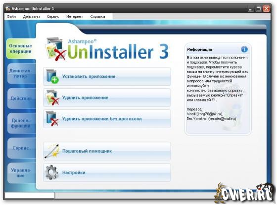 Ashampoo UnInstaller отслеживает и регистрирует изменения, которые вносят инсталляционные программы, что позволяет при необходимости корректно - то есть полностью - удалить ненужную программу. Положительным качеством является то, что UnInstaller удаляет не только те приложения, что были установленны с ее помощю, но и путем анализа деинсталлирует программы, мониторинг которых не производился. Кроме своей основной функции программа может: искать и удалять пустые папки; одинаковые и временные файлы; просматривать список всех установленных в системе шрифтов и удалять ненужные; удалять временные файлы Интернета, 'кэшированный' контент, файлы cookies, адреса сайтов введенные в ручную.