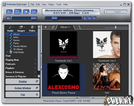 J.River Media Center - мультимедийный центр. Проигрывает большинство популярных аудио и видео форматов, включая MP3, аудио CD и DVD, может преобразовывать CD-аудиотреки в WAV и MP3, переписывать на жесткий диск виниловые диски и кассеты, а также создавать аудио-CD, причем для всех этих функций программа имеет множество настраиваемых параметров. Кроме этого, есть очень хороший и мощный по своим возможностям органайзер мультимедийных файлов, медиаредактор, эквалайзер, встроенный DSP и удобный планировщик заданий для автоматизации процессов проигрывания/записи, а также поддержка пульта ДУ. Из необязательных, но приятных функций - становящаяся уже почти стандартом для "приличных" программ возможность изменения внешнего вида с помощью скинов, мини-режим проигрывателя и "телевизор".