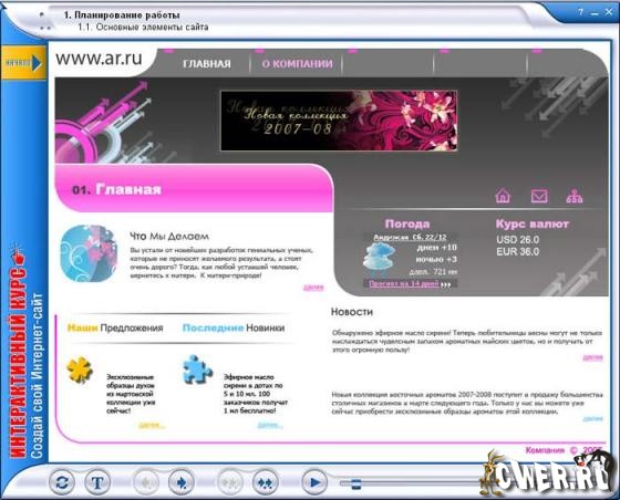 Интерактивный курс "Создай свой интернет-сайт" представляет собой практические советы в виде интерактивных видео-уроков по созданию собственных интернет-сайтов. Просмотрев этот курс, вы узнаете, как создать макет будущего сайта, подготовить графические изображения и Flash-баннеры для размещения на web-странице. Вы научитесь создавать локальную версию сайта, работать с таблицами, самостоятельно разрабатывать интерактивные элементы, такие как Flash-ролик, текст или рисунок, реагирующие на действия мыши. Кроме того, в рамках этого курса, будет рассмотрен такой важный аспект автоматизации работы как шаблоны страниц. Научившись создавать шаблоны страниц, вы сможете создавать интернет-сайты легко и быстро. В течение всего интерактивного курса идет работа над одним и тем же проектом, от макетирования до просмотра в браузере готового результата, что позволит вам изучить все этапы создания сайта на практике.