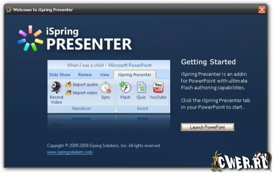 iSpring Presenter - программа для преобразования презентаций PowerPoint в формат Flash. Продукт ориентирован на пользователей Microsoft PowerPoint и позволяет создавать презентации, учебные курсы, баннеры, открытки в формате Flash. Преобразование занимает несколько секунд, а качество полученных Flash-презентаций остается неизменным.