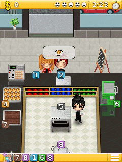 В данной игре вы должны будет обслуживать посетителей, наливая им кофе и подавая пирожные. Но не стоит медлить: клиенты не любят долго ждать! Заработайте как можно больше денег, насколько это возможно, а затем вложите их в модернизацию вашего магазина. Размеры экранов: 128x128, 176x220, 240x320.