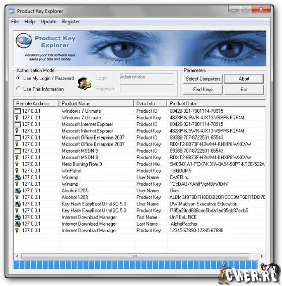 После запуска программы достаточно будет нажать Find Keys и она сама просканирует реестр, и выдаст список программ, установленных на компьютере и регистрационные данные к нем. В программе есть окно для авторизации Администратора, если установлены ограничения на уровне пользователей. Может работать по сети с другими компьютерами и по заданному диапазону IP адресов или по списку IP в текстовом документе.