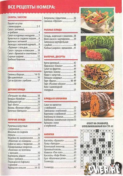 Очередной выпуск журнала по кулинарии с традиционными рубриками: салаты и закуски, супы, детские блюда, горячие блюда, рыбные блюда, выпечка и десерты, блюда из клубники, напитки.