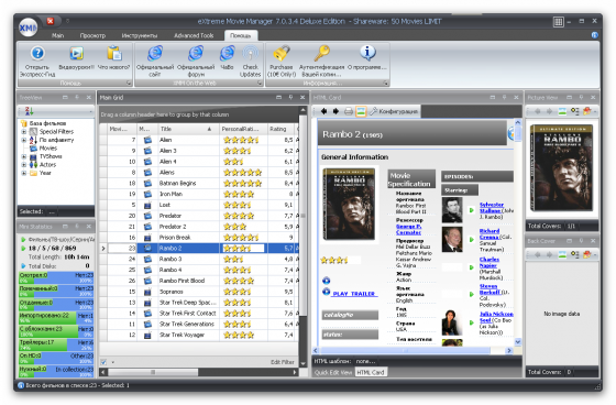 eXtreme Movie Manager - лучшая программа для ведения домашней фильмотеки. Для каждого фильма предоставлено более 70 (!) полей описания, разделенных по подгруппам. Возможность импорта данных со специализированных сайтов, есть возможность создания собственного импорт-скрипта. Программа поддерживает все существующие сегодня форматы файлов от *.avi и *.mpg до RealMedia. При помощи eXtreme Movie Manager можно не только вести учет коллекции, но и воспроизводить видеофайлы. Программа имеет возможность сканировать диск на наличие имеющихся на винчестере мультимедийных файлов, разрешение которых вы укажете в настройках, и автоматически составляет из них каталог.