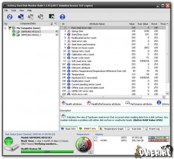 Active@ Hard Disk Monitor Pro – это дисковая утилита, которая проверяет и наблюдает за состоянием ваших жестких дисков, чтобы помочь в предотвращении потери данных. Система основывается на анализе самомониторинга и технологии отчетности (S.M.A.R.T.). Данная программа наблюдает за параметрами жесткого диска, такими как: температура, высота полета головки и время раскрутки и уведомляет пользователя, когда жесткий диск достигает критических нагрузок. Active@ Hard Disk Monitor также отображает информацию жесткого диска, текущие атрибуты S.M.A.R.T. и общее состояние жесткого диска. Продвинутое сканирование диска позволит вам обнаружить плохие сектора на поверхности жесткого диска. Данная программа может автоматически запускаться вместе с операционной системой и наблюдать за системой в фоне. Иконка в системном трее может отображать температуру выбранных жестких дисков.