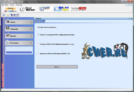 Video DVD Maker может создавать DVD на основе видеофайлов в форматах AVI, DIVX, XVID, MP4, MPG, WMV, ASF, MOV, а также выполнять захват видео с ТВ-тюнера, веб-камеры, DV-камеры и других устройств. Работа программы организована в виде пошагового мастера, и процесс создания диска разбит на три этапа: захват видео, добавление дополнительных файлов, запись DVD. Программа поддерживает запись на любые типы дисков, в том числе двухслойные DVD. Русский интерфейс присутствует.
