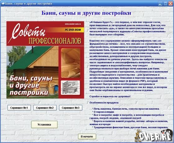 Кроме описания конструкций бань, на диске размещено много материалов о сооружении водоемов, хозяйственных, декоративных и других построек, необходимых на дачном участке. Здесь вы найдете ответы на часто задаваемые и "неспецифичные" вопросы. Например, электрозащита и водоснабжение, чем следует руководствоваться при выборе печи-каменки для бани. Подробные сведения о материалах, особенности и маленькие хитрости надворного строительства - для практичных и хозяйственных мужчин.