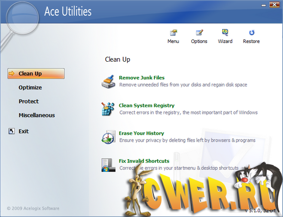 Ace Utilities - отличная программа для очистки системы от всякого мусора. Сканирует жесткий диск компьютера и удаляет одинаковые и ненужные файлы, ложные ярлыки, историю, ненужные ключи реестра и прочий мусор. Имеет удобную утилиту автозапуска программ при старте, содержит удобную возможность удалять программы и прочее. Так же есть небольшие возможности твикинга - управление скрытыми опциями ОС.
