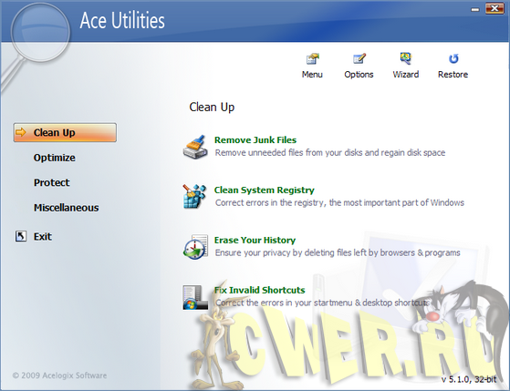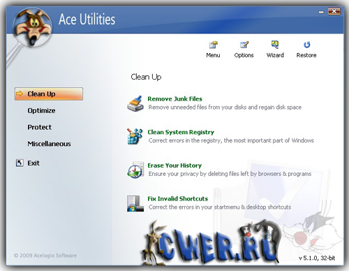 Ace Utilities - отличная программа для очистки системы от всякого мусора. Сканирует жесткий диск компьютера и удаляет одинаковые и ненужные файлы, ложные ярлыки, историю, ненужные ключи реестра и прочий мусор. Имеет удобную утилиту автозапуска программ при старте, содержит удобную возможность удалять программы и прочее. Так же есть небольшие возможности твикинга - управление скрытыми опциями ОС.