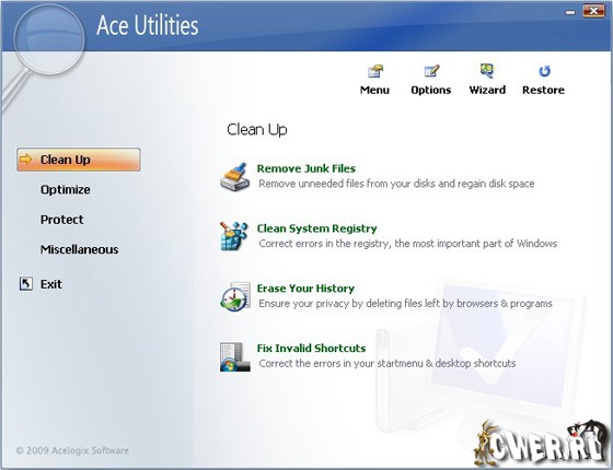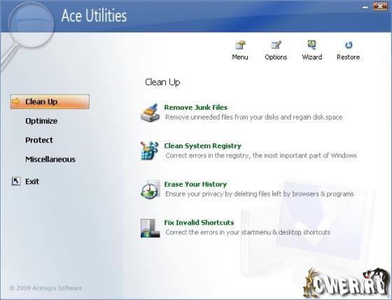 Ace Utilities - отличная программа для очистки системы от всякого мусора. Сканирует жесткий диск компьютера и удаляет одинаковые и ненужные файлы, ложные ярлыки, историю, ненужные ключи реестра и прочий мусор. Имеет удобную утилиту автозапуска программ при старте, содержит удобную возможность удалять программы и прочее. Так же есть небольшие возможности твикинга - управление скрытыми опциями ОС.