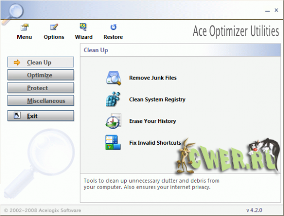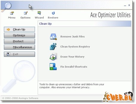 Ace Utilities - отличная программа для очистки системы от всякого мусора. Сканирует жесткий диск компьютера и удаляет одинаковые и ненужные файлы, ложные ярлыки, историю, ненужные ключи реестра и прочий мусор. Имеет удобную утилиту автозапуска программ при старте, содержит удобную возможность удалять программы и прочее. Так же есть небольшие возможности твикинга - управление скрытыми опциями ОС.