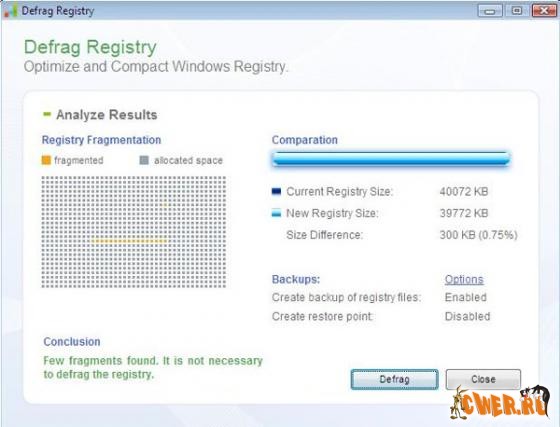 Небольшая бесплатная утилита, предназначенная для дефрагментации реестра. Как известно, данные в реестре постоянно пополняются, перезаписываются и удаляются, поэтому с течением времени они становятся фрагментированными. Quicksys RegDefrag позволит оптимизировать реестр путем устранения отдельных фрагментов и впустую используемого пространства. Тем самым, улучшится производительность и ускорится доступ к реестру. В версии 1.3 улучшена поддержка 64-битных версий Windows, улучшен интерфейс, добавлены новые локализации, исправлены ошибки.