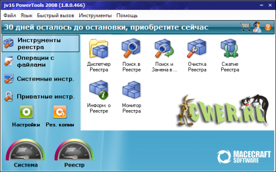 jv16 PowerTools - это одна из лучших программ для работы с системным реестром и поддержания в оптимальном состоянии. Включает в себя инструменты для работы с реестром: мощный менеджер реестра - позволяет работать со списком программ из автозагрузки и деинсталляции, со списком зарегистрированных в системе типов файлов, расширений, контекстным меню IE (с тем, в которое часто вставляют свои пункты менеджеры закачек) и некоторыми другими. Этот менеджер часто помогает вручную удалить остатки после автоматической очистки реестра программы. Возможно использование в локальной сети.