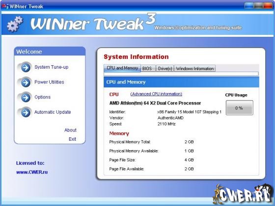 Эта программа предоставляет в распоряжение пользователя целый набор модулей для всесторонней настройки системы и улучшения ее работы. Это и инструменты для тонкой настройки Windows, и дополнительные утилиты для оптимизации, такие как очистка диска от ненужных файлов, удаление ярлыков, оптимизация реестра, генератор паролей удаление файлов без возможности восстановления. WINner Tweak имеет очень много настроек, и если изменения какого-нибудь из них скажется на работе системы не корректно, вы можете вернуть все исходные настройки. Для этого в программе существует опция резервного копирования данных. В новой версии добавлены новые мастера, менеджер запущенных процессов, множество новых твиков системы.
