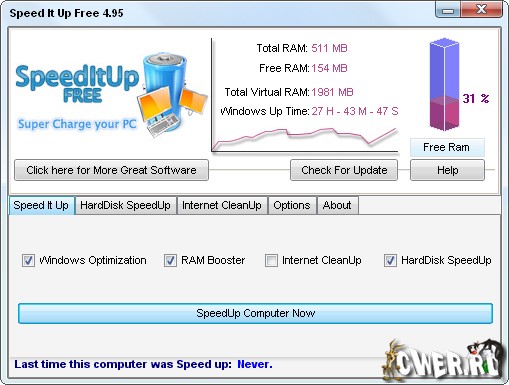 SpeedItUp Free увеличит скорость работы системы, работающей под Windows XP или Microsoft Windows Vista. Использует технологию оптимизации Работы Жесткого Диска, которая позволяет считывать данные почти в 3 раза быстрее. SpeedItup Free также оптимизирует работу RAM позволяет поменять настройки так, что увеличится скорость Интернет соединения и производительность компьютера в общем.