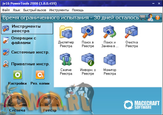 jv16 PowerTools 2008 - это одна из лучших программ для работы с системным реестром и поддержания в оптимальном состоянии. Включает в себя инструменты для работы с реестром: мощный менеджер реестра - позволяет работать со списком программ из автозагрузки и деинсталляции, со списком зарегистрированных в системе типов файлов, расширений, контекстным меню IE (с тем, в которое часто вставляют свои пункты менеджеры закачек) и некоторыми другими. Этот менеджер часто помогает вручную удалить остатки после автоматической очистки реестра программы. Возможно использование в локальной сети.
