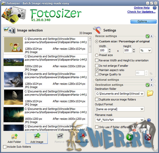 Программа Fotosizer предназначена для пакетной обработки графических изображений, а именно изменения их размеров. Программа позволяет за раз обрабатывать сразу большое количество картинок (целые директории), поддерживаются .JPG, .JPEG, .PNG, .BMP и .GIF форматы.